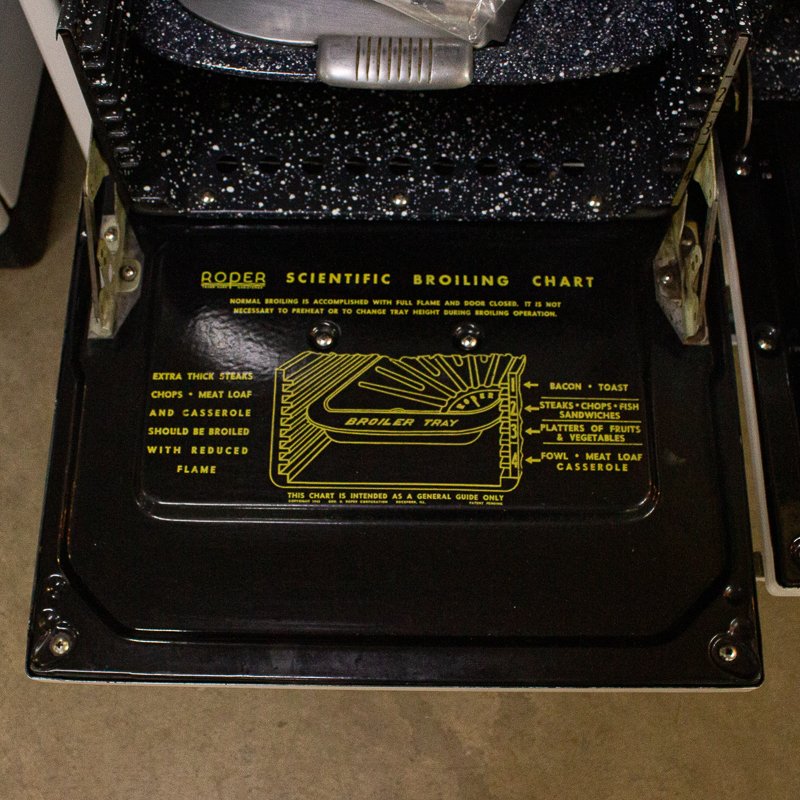 Side by side oven and broiler, 4 burner, storage door and storage drawer. Exceptional condition, but missing one handle.
