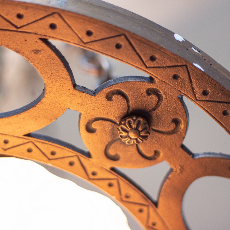 Early 20th century milk glass acorn and cast brass ring with brass chains in a western style. Approximately 27 inches to top of canopy, about 19 inches wide. Height can be adjusted.