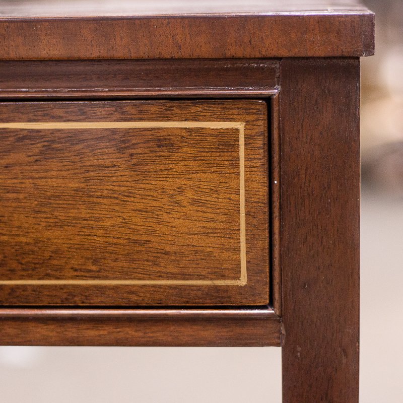 These mahogany tables date from the early 20th century, most likely the 1920’s. Featuring tapered legs with low shelf, brass oval pull, and gold accents on top and drawer fronts.