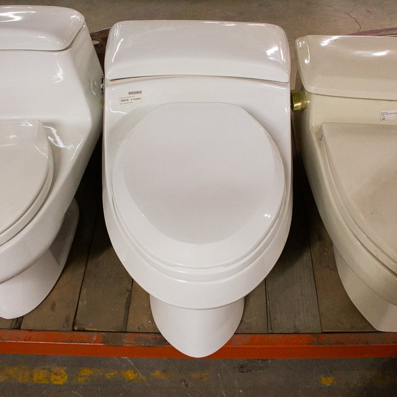 White, low-rise one-piece toilet with pump flush technology - each flush under pressure.