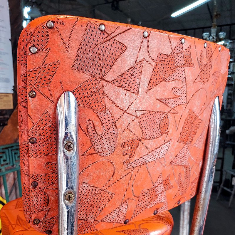 Vintage Krome Craft style barstools with steel tubing construction and red geometric patterned vinyl upholstery. Four available. Seats are 29.5 inches from the ground.