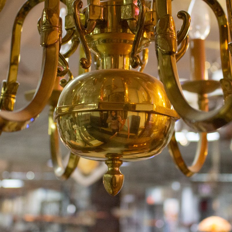 Bent brass square stock arms with hexagonal drip plates and candle bulb design. Circa 2002.